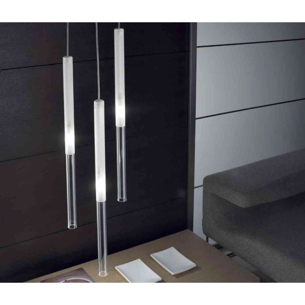 Lampa wisząca wykonana z metalowego klosza i gwintowanego szkła borokrzemianowego. Szkło matowe w części górnej i przezroczyste w części dolnej.