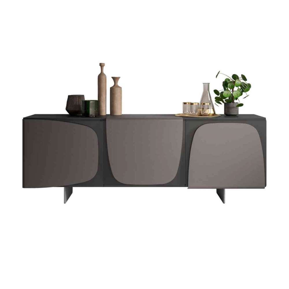 Lakierowany kredens, wewnętrzne półki ze szkła, metalowe nóżki lakierowane.
