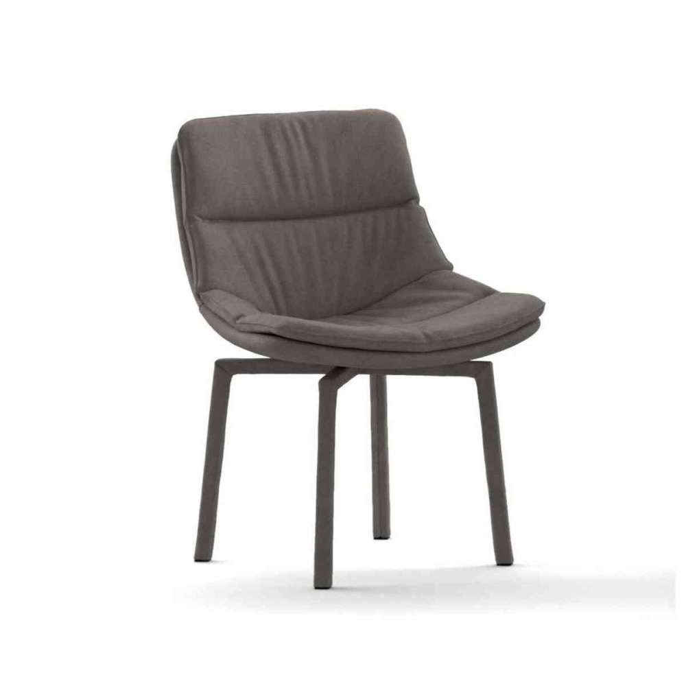Fotel obrotowy ze sprężyną powrotną w całości pokryty skórą lub aksamitem. Miękkie i otulające siedzisko, szwy na plecach rysują jego kształty i przepuszczają miękkość. Ten fotel oferuje wiele możliwości kombinacji, aby dopasować się do każdego środowiska i okoliczności.
