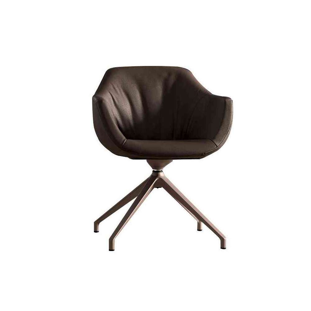 Obrotowy fotel z metalową podstawą i siedziskiem pokrytym aksamitem, miękką skórą nabuk lub miękką skórą.