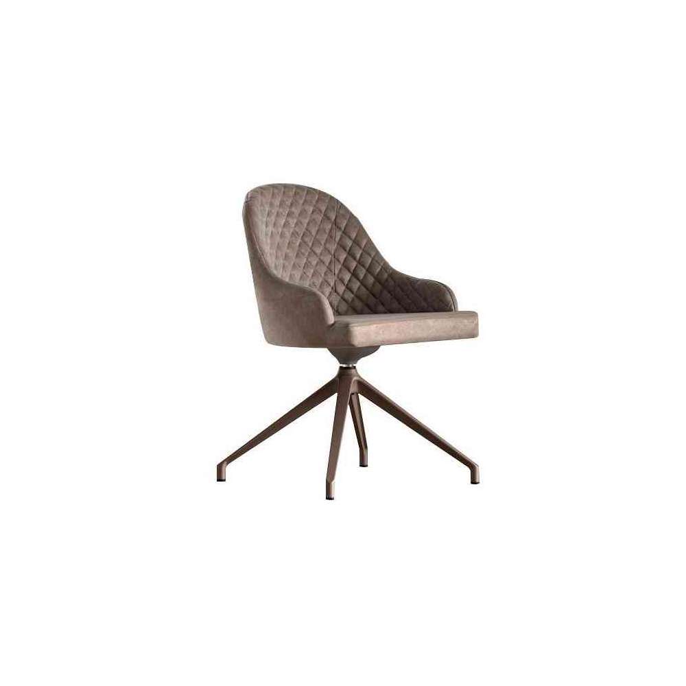 Fotel obrotowy z siedziskiem obitym miękką skórą, miękką ekoskórą nabuk lub aksamitem. Metalowa podstawa.