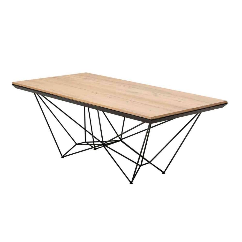 Rozkładany stół do jadalni z metalową konstrukcją, drewnianym lub cementowym blatem i przedłużeniami, metalowy mechanizm przesuwania.