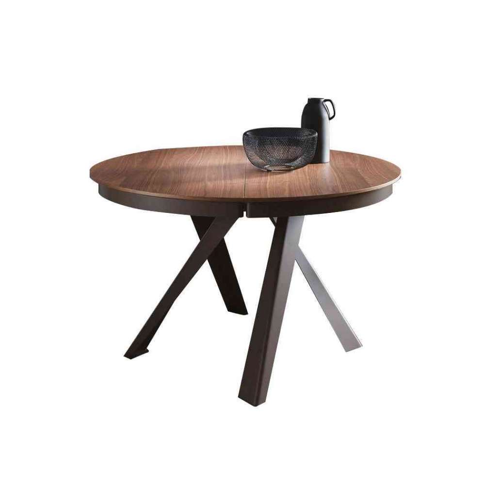 Rozkładany stół jadalny, metalowa podstawa, drewniany blat i wewnętrzne przedłużenie.