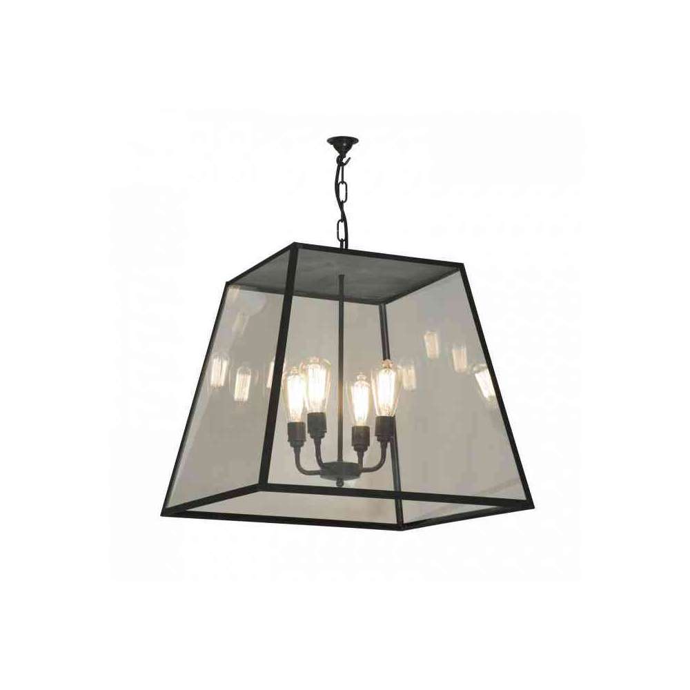 Mała, średnia, duża lub bardzo duża lampa wisząca Quad z wyblakłego mosiądzu. Zawieszony na wyblakłym mosiężnym haku i 1,5 metra łańcuszku. Szkło z czterech stron, z zamkniętą górą do użytku zewnętrznego.