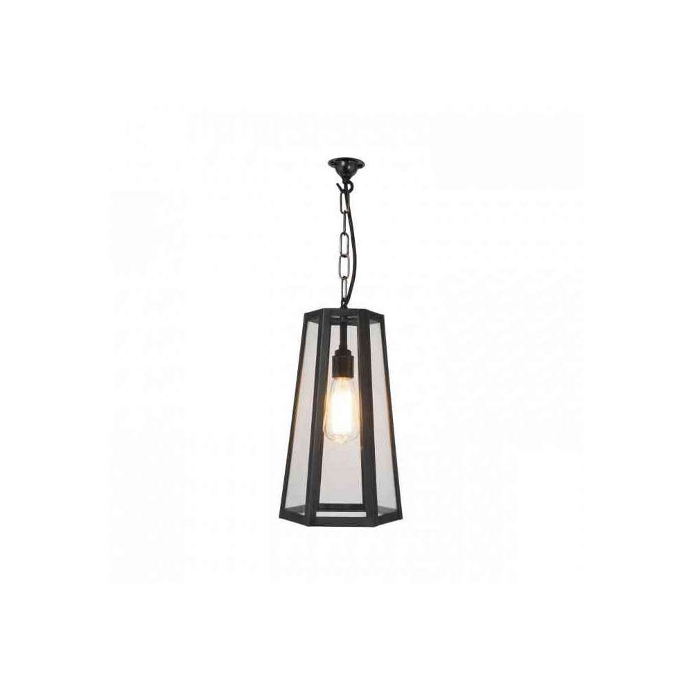 Lampa wisząca w stylu pudełkowej latarni z 6 wewnętrznie przeszklonymi bokami. Wykonana z wyblakłego mosiądzu i z przezroczystego lub matowego szkła, lampa jest dostarczana z 1,5-metrowym kablem i łańcuszkiem oraz z pasującą płytą z haczykiem sufitowym.