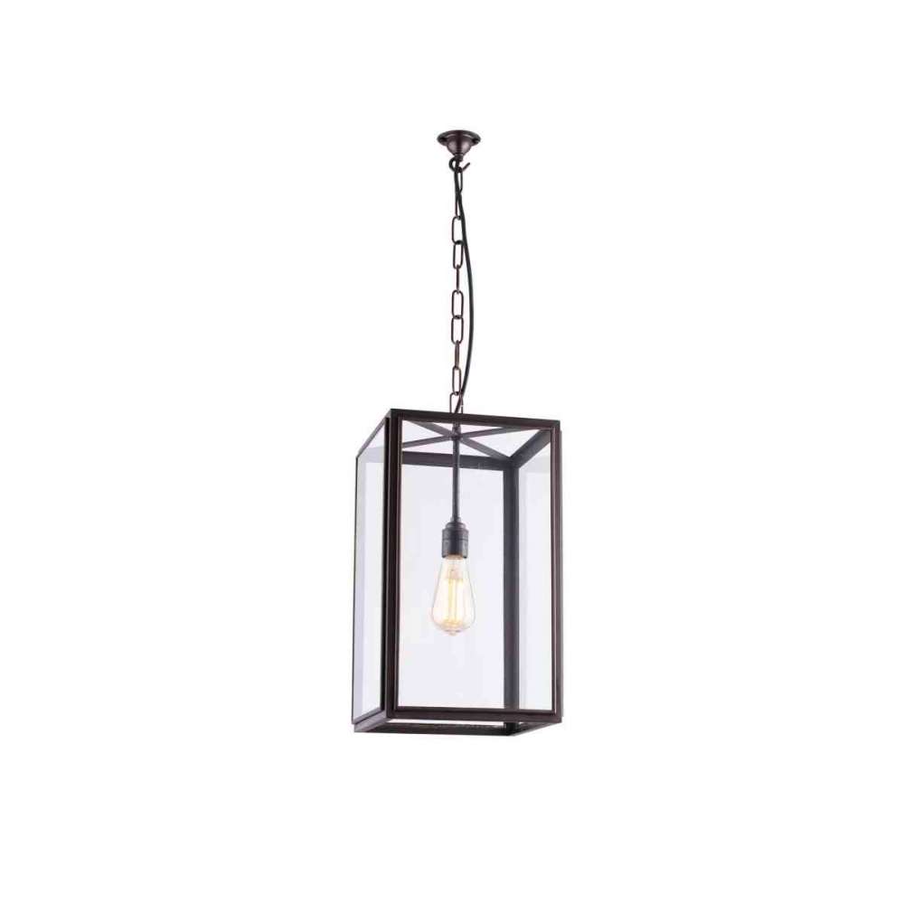 Kwadratowa oprawa wisząca z wyblakłego mosiądzu, zewnętrznie szkliwiona, dostępna w trzech rozmiarach. Zawieszony na wyblakłym mosiężnym haku na łańcuszku o długości 1,5 metra. Szkło z czterech stron, z otwartą górą i podstawą.