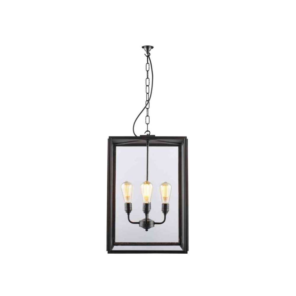 Zewnętrzna kwadratowa lampa wisząca z wyblakłego mosiądzu, zewnętrznie szkliwiona i dostępna w trzech rozmiarach. Zawieszony na wyblakłym mosiężnym haku na łańcuszku o długości 1,5 metra. Szkło z czterech stron, z zamkniętą górą do użytku zewnętrznego.