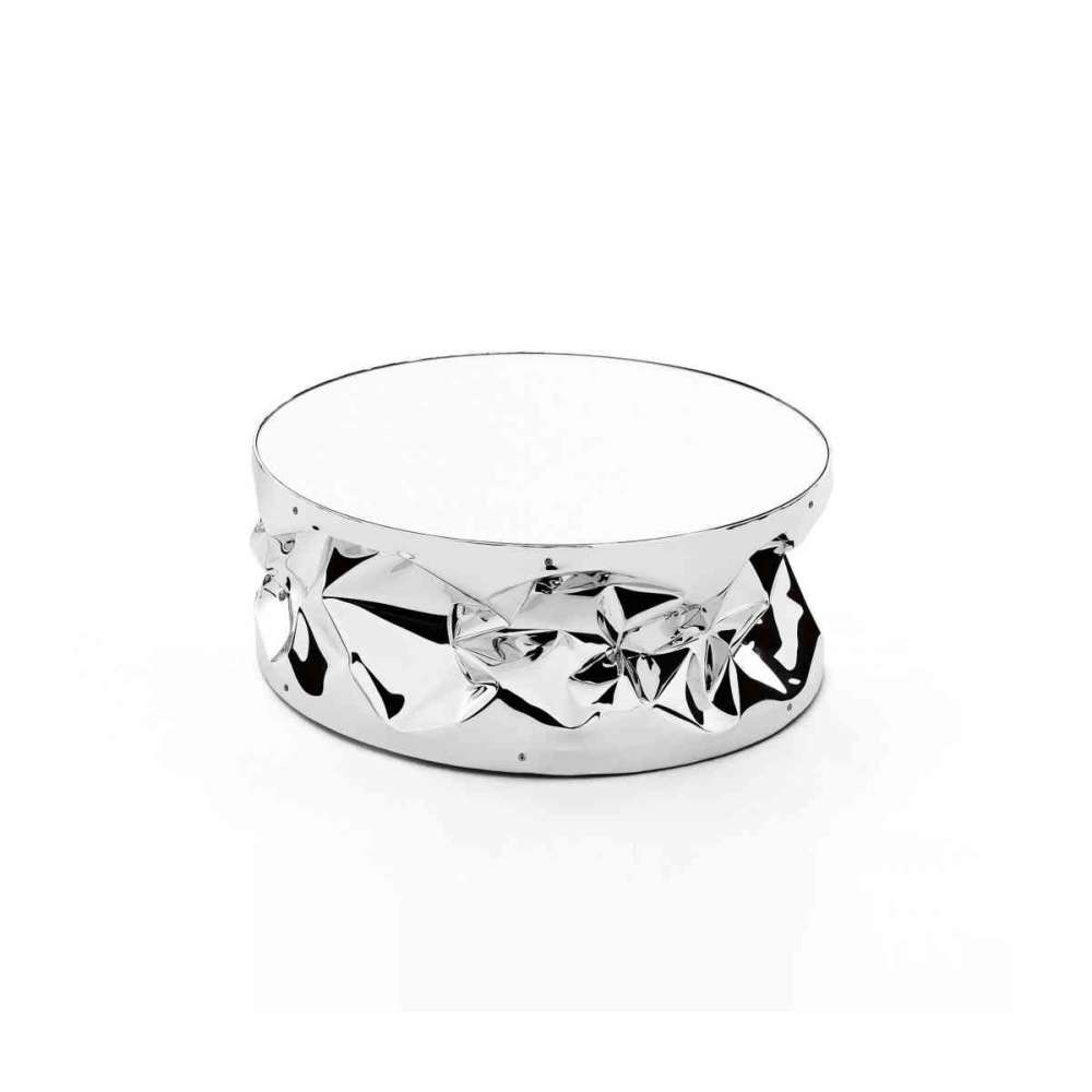 STOLIK na kółkach, z ręcznie marszczonego aluminium z wewnętrzną konstrukcją z masywnego drewna. Wykończenie: satynowane aluminium/blat lustrzany, chromowany/lustrzany blat, złoty/złoty lustrzany blat, czarny/czarny szklany blat, biały/biały szklany blat.