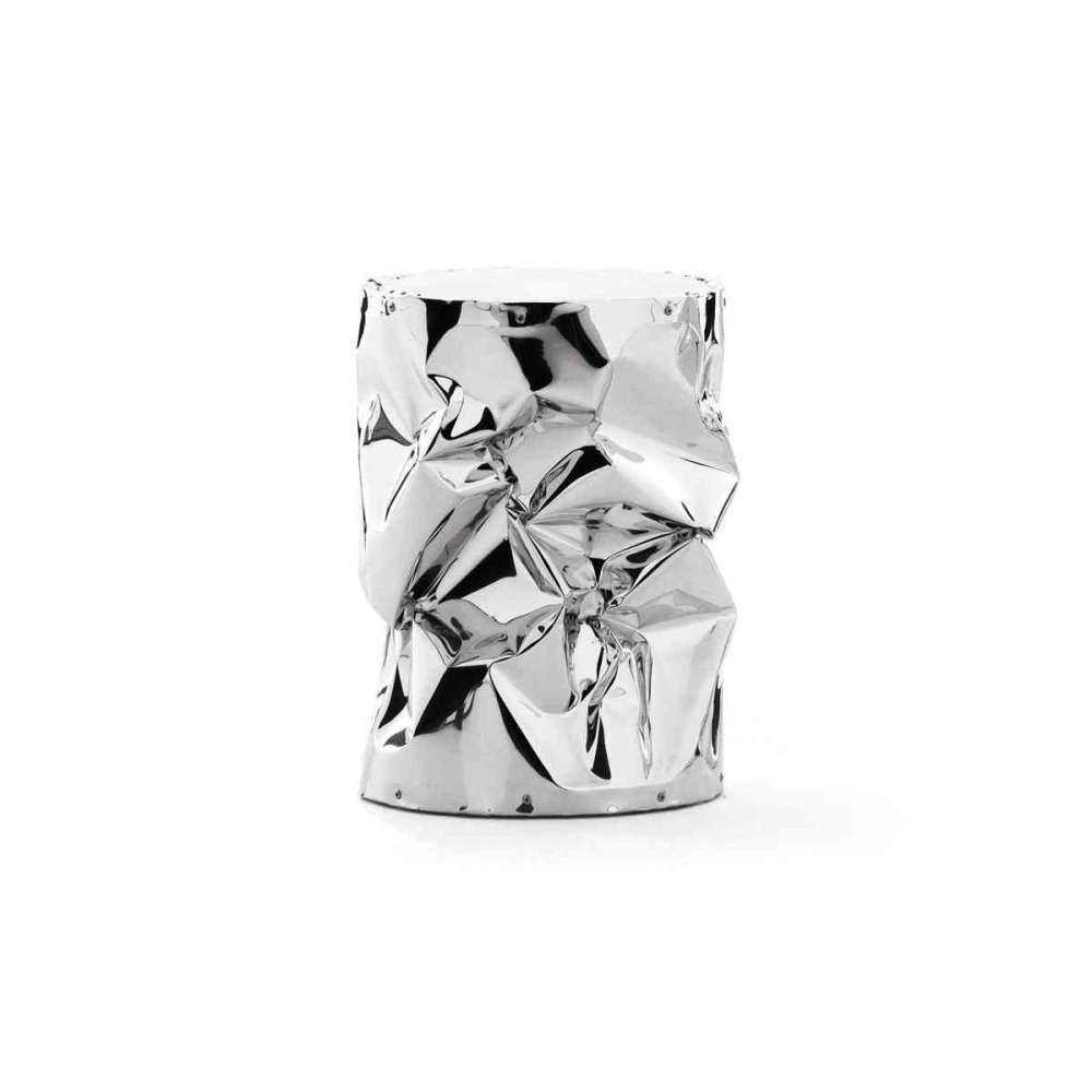 STOŁEK z ręcznie marszczonego aluminium z masywną drewnianą strukturą wewnętrzną. Ciemnoszara antypoślizgowa poduszka z grubego filcu. Wykończenie: satynowane aluminium, chromowane, lustrzane złoto, polerowana biel i czerń.