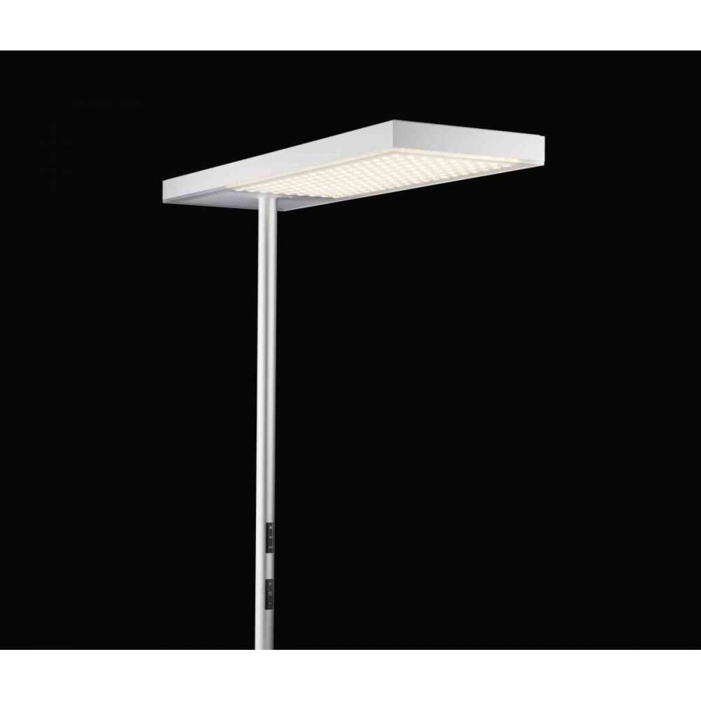 Oprawa LED na miejsce pracy z przełączanym komponentem światła pośredniego, rozsył światła: 70% w górę, 30% w dół, dyfuzor ze szkła akrylowego do redukcji olśnienia i kierowania światła w dół za pomocą precyzyjnie rozmieszczonych stożkowych wgłębień, nadaje się do oświetlania miejsca pracy zgodnie z normą DIN EN 12464-1, głowica i rura oprawy z aluminium, chromowane lub anodowane (patrz matryca), podstawa ze stali lakierowanej (antracyt/RAL 7016 lub szary aluminium), możliwość ściemniania, czujnik obecności i czujnik światła otoczenia mogą być aktywowane oddzielnie, obsługa oprawy za pomocą dwóch jednostek sterujących pojemnościowych (oprawa)