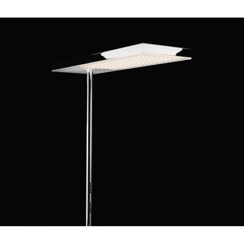 Oprawa LED na miejsce pracy z przełączanym komponentem światła pośredniego, rozsył światła: 70% w górę, 30% w dół, dyfuzor ze szkła akrylowego do redukcji olśnienia i kierowania światła w dół za pomocą precyzyjnie rozmieszczonych stożkowych wgłębień, nadaje się do oświetlania miejsca pracy zgodnie z normą DIN EN 12464-1, głowica i rura oprawy z aluminium, chromowane lub anodowane (patrz matryca), podstawa ze stali lakierowanej (antracyt/RAL 7016 lub szary aluminium), możliwość ściemniania, czujnik obecności i czujnik światła otoczenia mogą być aktywowane oddzielnie, obsługa oprawy odbywa się za pomocą dwóch pojemnościowych jednostek sterujących mm (oprawa)