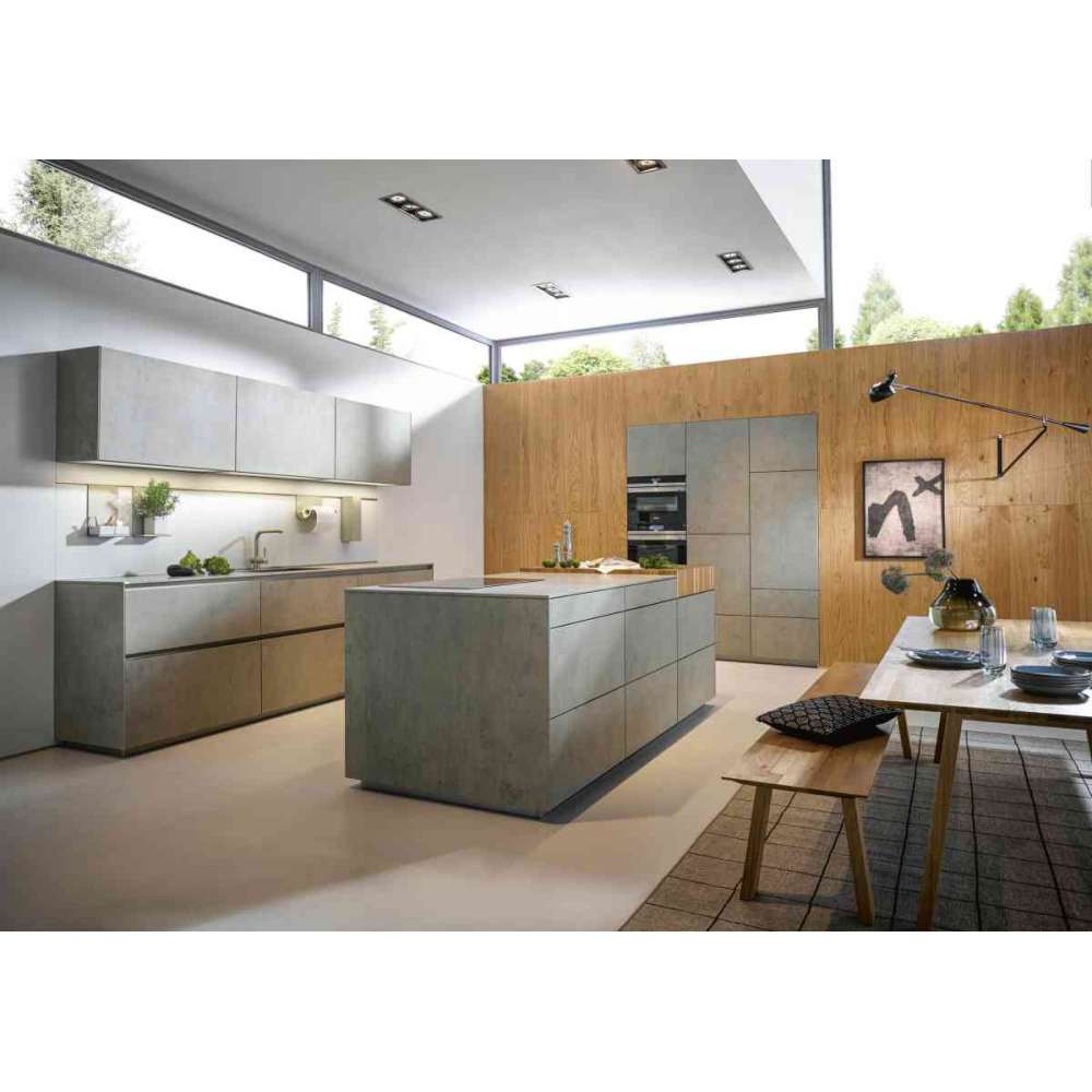 Wolnostojąca strefa gotowania z imitacją szarego betonu ceramicznego wydaje się być wyciosana z jednego bloku.