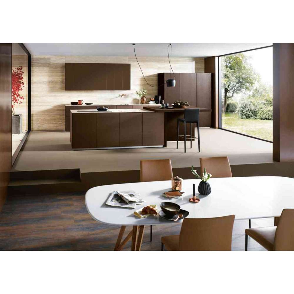 Matowa lakierowana powierzchnia w ciągle zmieniającym się brązie delikatnie mieni się, spokojne wyrównanie połączeń rozciąga się na całą kuchnię. Bez uchwytu, bez nierówności, po prostu sprowadzenie do esencji. Pomimo smukłego wyglądu szafki ścienne oferują wystarczająco dużo miejsca do przechowywania dużych naczyń i są również uderzającą cechą. W centrum technologicznym urządzenia elektroniczne i akcesoria są schowane za wysuwanymi drzwiami, dzięki czemu kuchnia od razu znów wygląda idealnie.