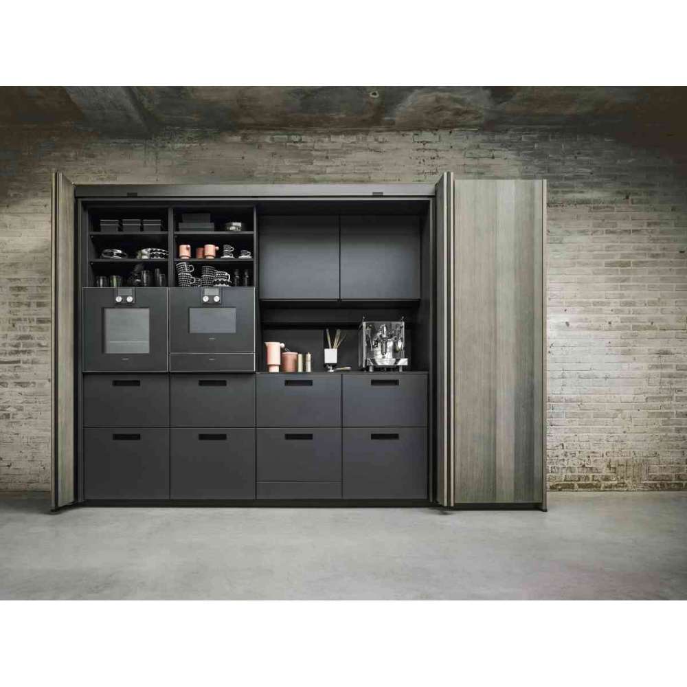 Wysoka szafka z wysuwanymi drzwiami może idealnie ukryć sprzęt kuchenny i przybory kuchenne, zapewniając przyciągający wzrok element architektoniczny i tworząc schludny i zorganizowany wygląd w kuchni. Drzwi z szarego, sękatego dębu otwierają się cicho po naciśnięciu i nadają pomieszczeniu eleganckiego, rustykalnego uroku – również wnętrze można zaprojektować indywidualnie.