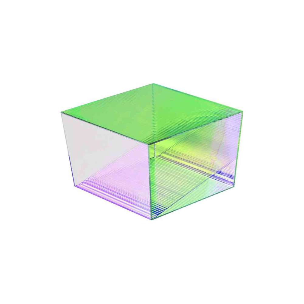 Prosta i purystyczna forma, elegancki wygląd i styl: cienkie, równoległe rowki żebrowanego szkła biegnące po obwodzie nadają stołom Rho ponadczasowe, klasyczne piękno. Romboidalna kostka z dwoma otwartymi bokami zapewnia eleganckie połączenie widoczności i rozmycia. Projekt, który jest w całości tworzony z samego materiału. Wewnętrzna strona jest nieustrukturyzowana.
