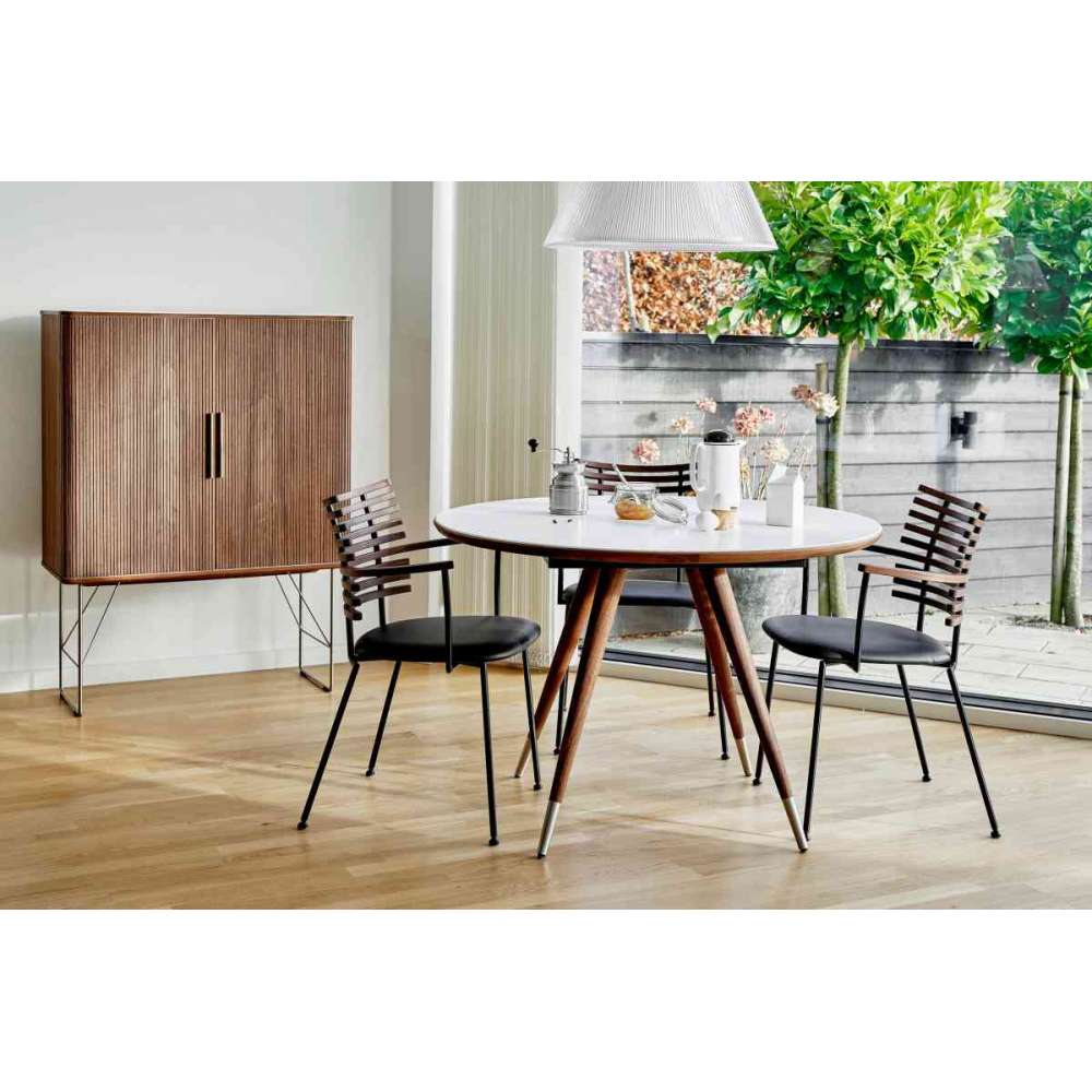 Mamy do zaoferowania kompletny nowy stół jadalny GM 3900 Edge. Zaprojektowany przez firmę Nissen & Gehl, która stworzyła stół z eleganckimi detalami i całkowicie nowym unikalnym profilem krawędzi. Stół jest dostępny w średnicy 110 cm lub 120 cm. Rozmiary, które najbardziej pasują, a przy rozkładanych liściach stół może mieć długość do 210 lub 220 cm. Nogi są umieszczone blisko środka stołu, dzięki czemu można ustawić krzesła dookoła stołu. Ponadto stół może być dostarczony z przedłużeniem na 2 skrzydła lub ze stałym blatem. Stół Edge dostępny jest również jako stół owalny dł. 200 cm, szer. 110 cm z dostawką na 2 liście w standardzie lub można zamówić z dostawką na 4 ławki. Jak zawsze w najlepszych materiałach: litym wiązie, jesionie, dębie lub orzechu - lub w połączeniu z Corianem, które podkreślają wyjątkowy profil krawędzi. Stół jest standardowo bez stalowych nakładek, ale za dopłatą może być dostarczony ze stalowymi nakładkami
