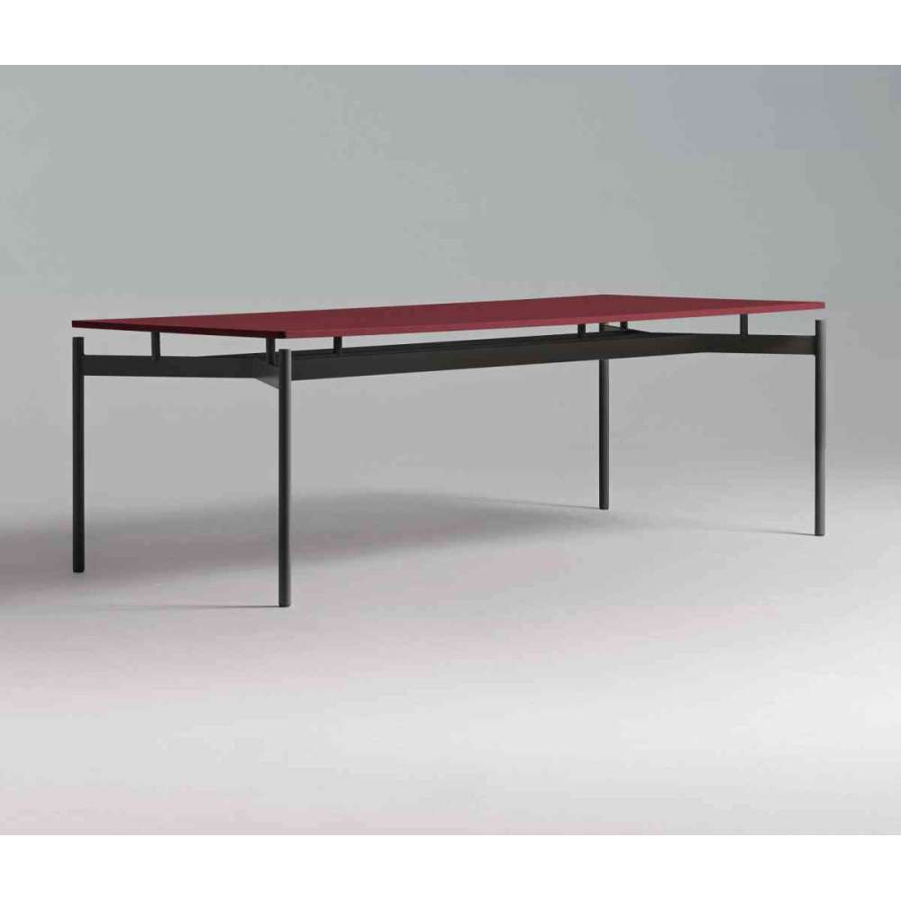 Stół. Rama wykonana z lakierowanej stali. Blat z matowego lakierowanego drewna, dębu poddanego obróbce cieplnej, dębu bejcowanego na czarno lub dymnego szarego szkła hartowanego, grubość 12 mm.