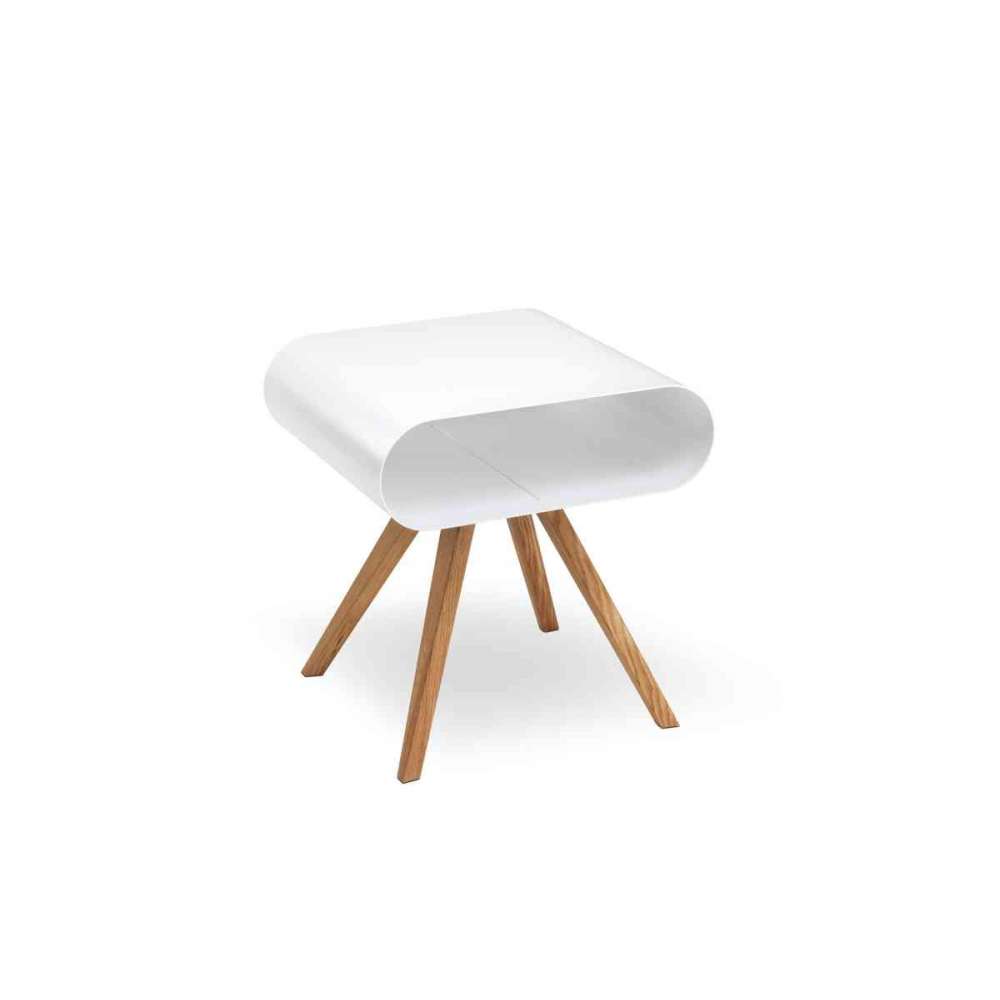 Stolik pomocniczy na każdą okazję. Wszechstronny w użyciu, jest niezbędnym dodatkiem dodającym miłego akcentu do Twojego domu. Inspiruje nas powierzchnia do przechowywania wykonana z giętego metalu wsparta na stojaku z litego dębu. Po prostu idealny stolik boczny lub stolik nocny. Może być lakierowany bezbarwnie lub wielokolorowo wg palety RAL w wykończeniu półmat.