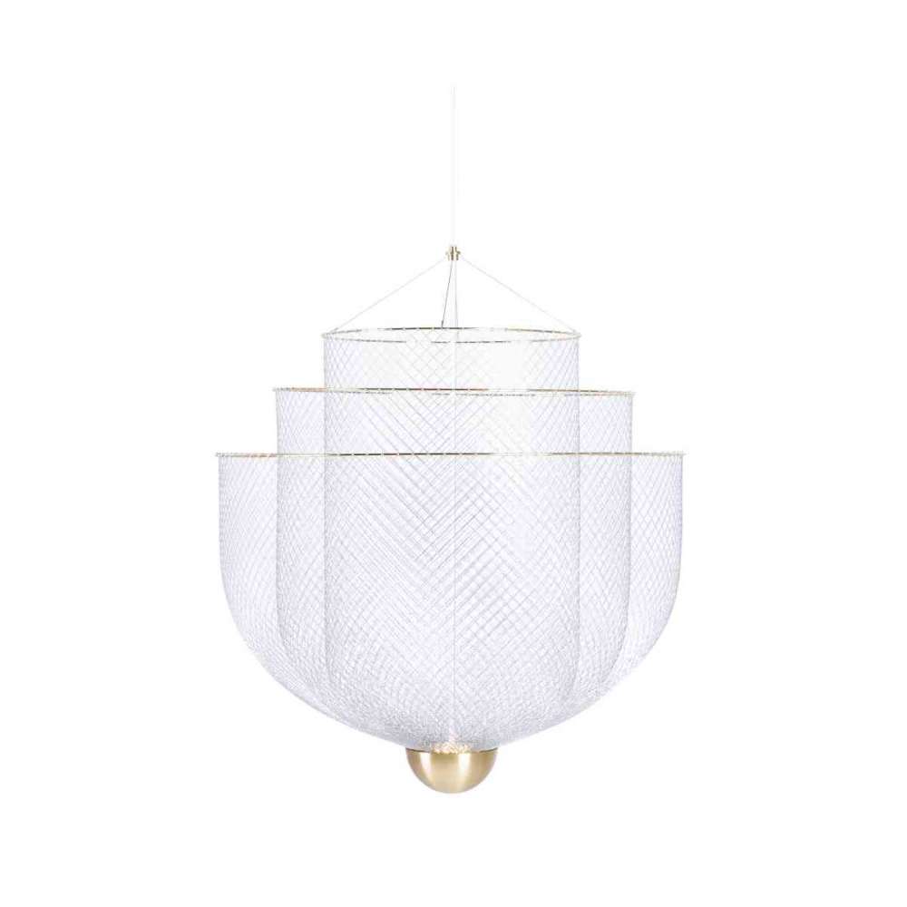 Wyrafinowany Żyrandol Meshmatics jest teraz dostępny w dwóch rozmiarach. Mały żyrandol Meshmatics jest wykonany z tego samego materiału i w taki sam sposób, jak jego elegancki starszy brat, ze skromnej drucianej siatki i za pomocą maszyny, która za pomocą zestawu narzędzi modeluje go z idealną dokładnością. Pełny potencjał materiału jest następnie rozciągany i uchwycony w trzech mniejszych warstwach piękna.
