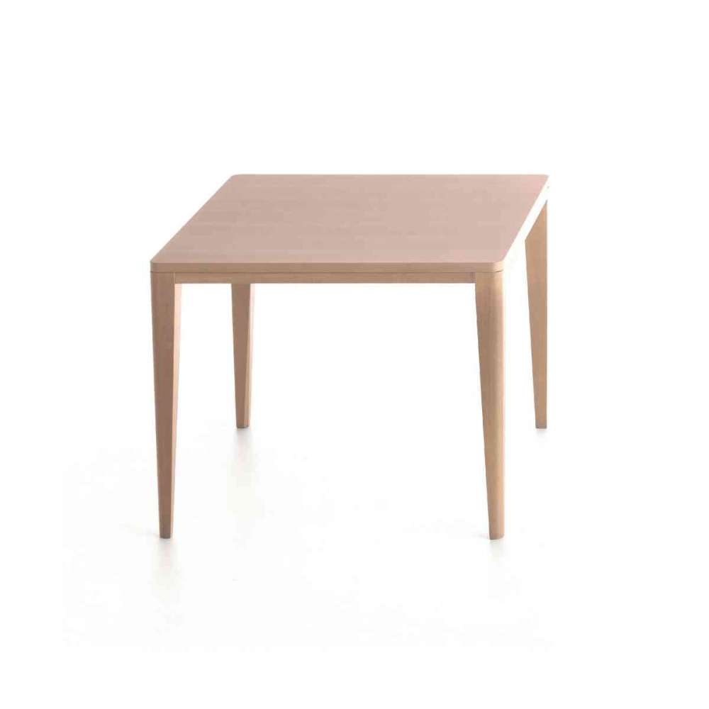 Stół 80x80xH.76 cm, 4 solidne kwadratowe drewniane nogi z zaokrągloną krawędzią zewnętrzną. Blat laminowany H.25 mm z krawędzią ABS i 4 zaokrąglonymi narożnikami lub blat fornirowany H.25 mm z krawędzią fornirowaną i 4 zaokrąglonymi narożnikami. Szyny między nogami.