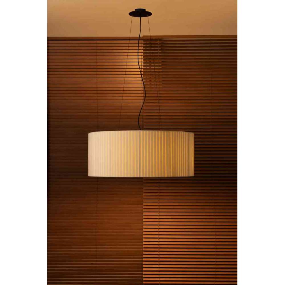 Półprzezroczysty dekoracyjny abażur za pomocą ręcznie wykonanego systemu cynowania, w wykończeniu w kolorze surowym. Centralny klosz z dmuchanego szkła opalowego triplex o średnicy 35 cm. Podstawa, do której przymocowane są klosze ze stali obrabianej maszynowo. Wykończenie białym matowym lakierem (RAL 9016). Zmechanizowana stalowa podstawa do montażu sufitowego. Wykończenie czarnym matowym lakierem (RAL 9005). Mocowanie ekranu ozdobnego za pomocą systemu magnesów. Linki stalowe, które pomagają regulować żądaną wysokość w zawieszeniu dzięki systemowi włączonemu w podstawę sufitową.