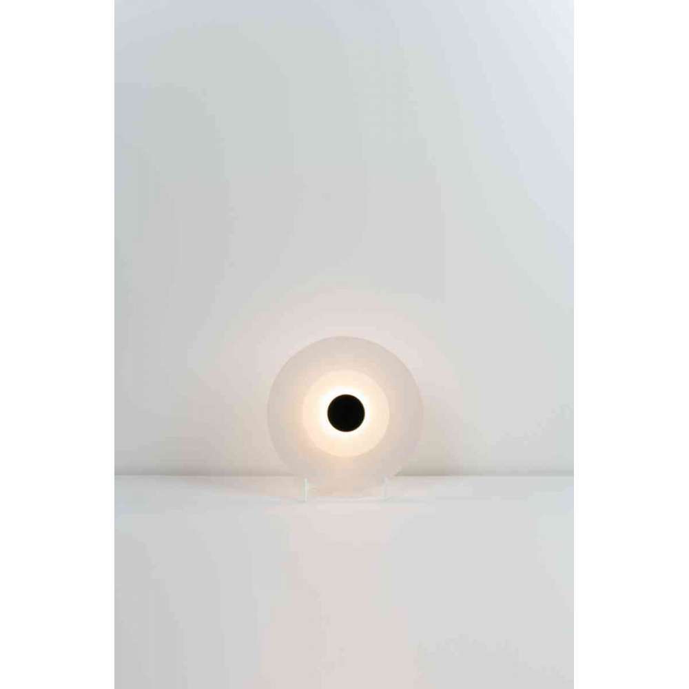 Jego czyste geometryczne kształty pozwalają dopasować się do każdej przestrzeni i nadają jej ponadczasową jakość. Subtelność, z jaką odbija światło na trawionych kwasem satynowych szklanych kloszach, zapewnia delikatny blask i łagodną obecność w przestrzeni. Aureole światła generowane w kręgach koncentrycznie do lakierowanej stalowej głowicy są tym, co nadaje jej nazwę. Seria obejmuje dwie wersje ścienne o różnych rozmiarach, lampę stołową i lampę podłogową z możliwością dostosowania jasności do własnych potrzeb.