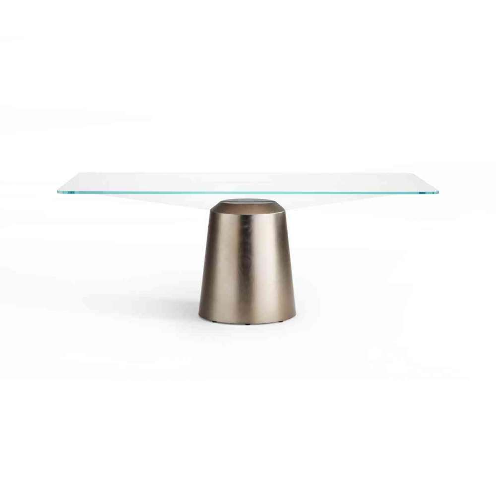 Spike, stały stół z centralną podstawą z malowanego lub matowego ocynkowanego metalu. Prostokątny lub okrągły blat ze szkła przezroczystego lub dymionego