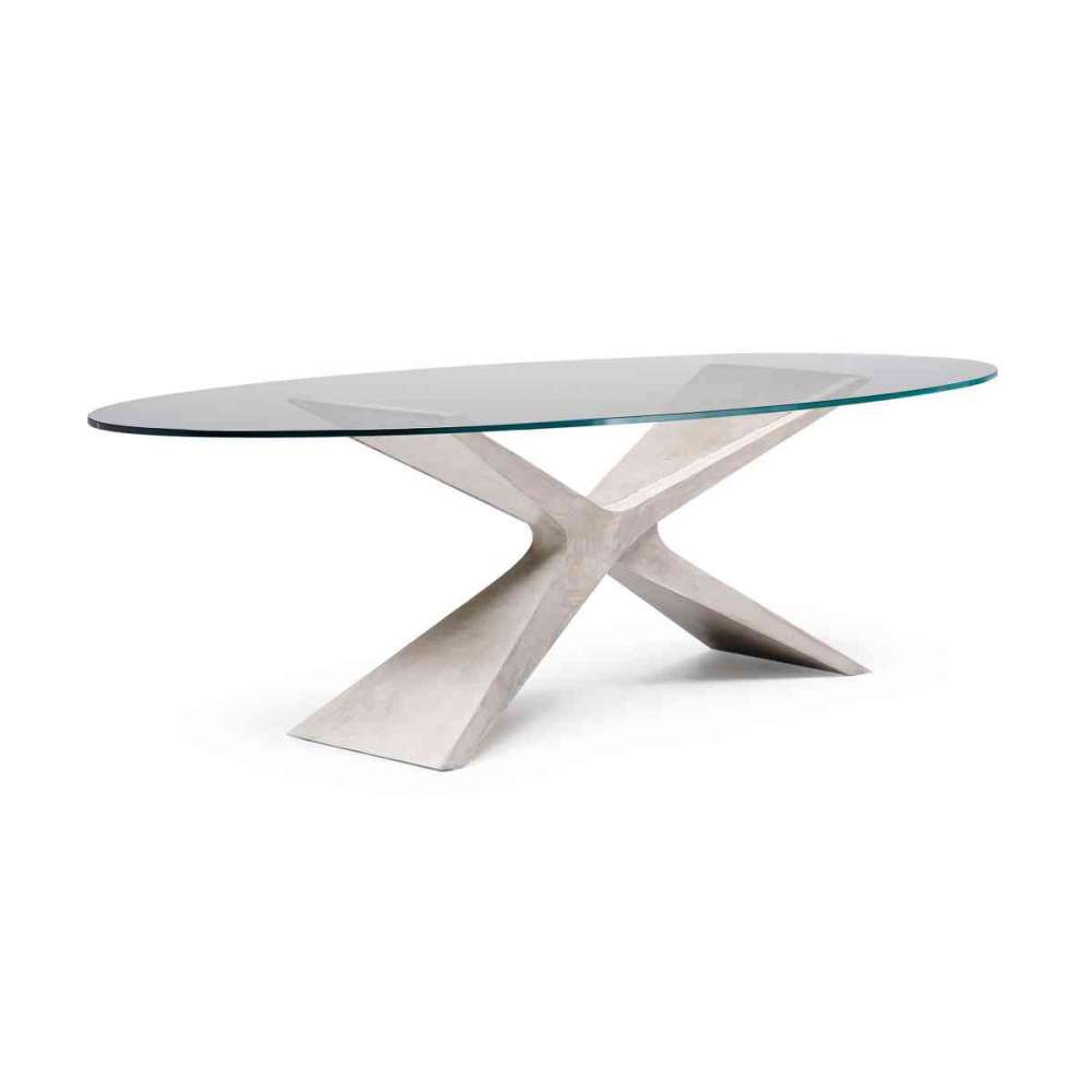 Stół stały z podstawą Baydur® lub szczotkowanym betonem, dostępny również w wersji dwukolorowej. Blat ze szkła, ceramiki kryształowej lub litego drewna. Blat z litego drewna dostępny w rozmiarze 250x106 cm. Blat szklany i kryształowo-ceramiczny (prostokątny z zaokrąglonymi rogami) dostępny w rozmiarach 220x116, 250x120, owalny 280x120.