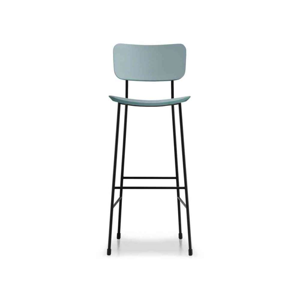 Stołek barowy ze stalową ramą na 4 nogach. Siedzisko i oparcie drewniane lub tapicerowane skórą naturalną, ekoskórą, tkaniną lub tkaniną na zamówienie. Dostępne w dwóch różnych wysokościach: 65 cm (25,6 cala) 75 cm (29,5 cala).