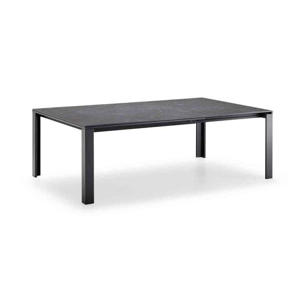 Rozkładany stół z podstawą na czterech nogach z lakierowanej stali. Blat i przedłużenia ze szkła lub ceramiki kryształowej.
