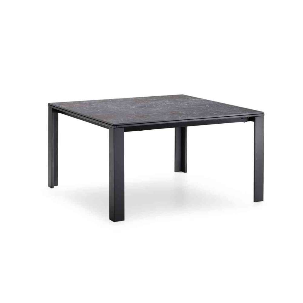 Rozkładany stół z podstawą na czterech nogach z lakierowanej stali. Blat i przedłużenia ze szkła lub ceramiki kryształowej.