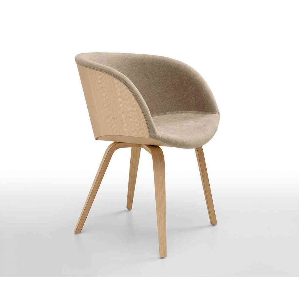 Fotel Danny z drewnianą podstawą. Skorupa tapicerowana skórą, ekoskórą, tkaniną lub tkaniną na zamówienie. Drewniana tylna ściana w tym samym wykończeniu bazowym.