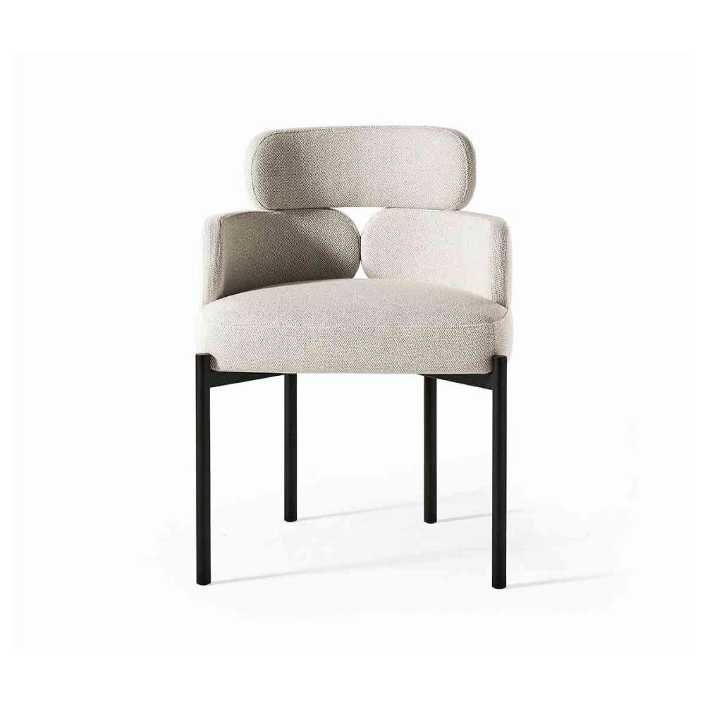 Sylvie to krzesło z zaokrąglonym i otaczającym oparciem, charakteryzujące się trzema objętościami, które razem tworzą idealną równowagę między geometrycznymi kształtami, inspiracją art déco i wygodą. Podstawa składa się z metalowej ramy lakierowanej na czarny mat, która rozjaśnia ogólny wygląd, sprawiając wrażenie, że siedzisko unosi się w powietrzu.