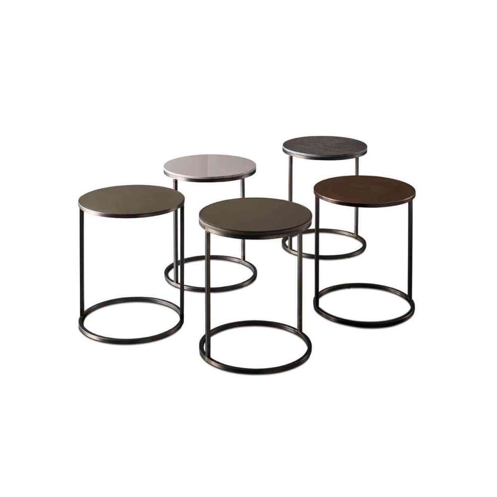 Niskie stoliki z okrągłym blatem i metalową ramą. Wygląd każdego elementu jest określony przez wybrane wykończenie blatów, dzięki czemu może wahać się od swobodnego wyglądu lakierów, przez elegancję i szlachetność skóry siodłowej i marmuru, po nowoczesność brązowego mosiądzu lub platynowej stali.