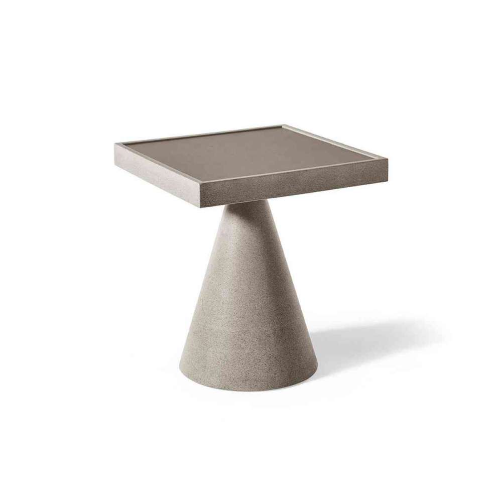Cone to kolekcja stolików kawowych z podstawą w kształcie stożka z betonu Ductal® z jasnoszarym wykończeniem. Wykonany z bardzo drobnych naturalnych składników mineralnych i włókien organicznych, które czynią go odpornym i elastycznym, ten beton jest najwyższej jakości i technologii. Błyszczący lub matowy lakierowany blat jest dostępny w kształcie kwadratu lub okrągłego.