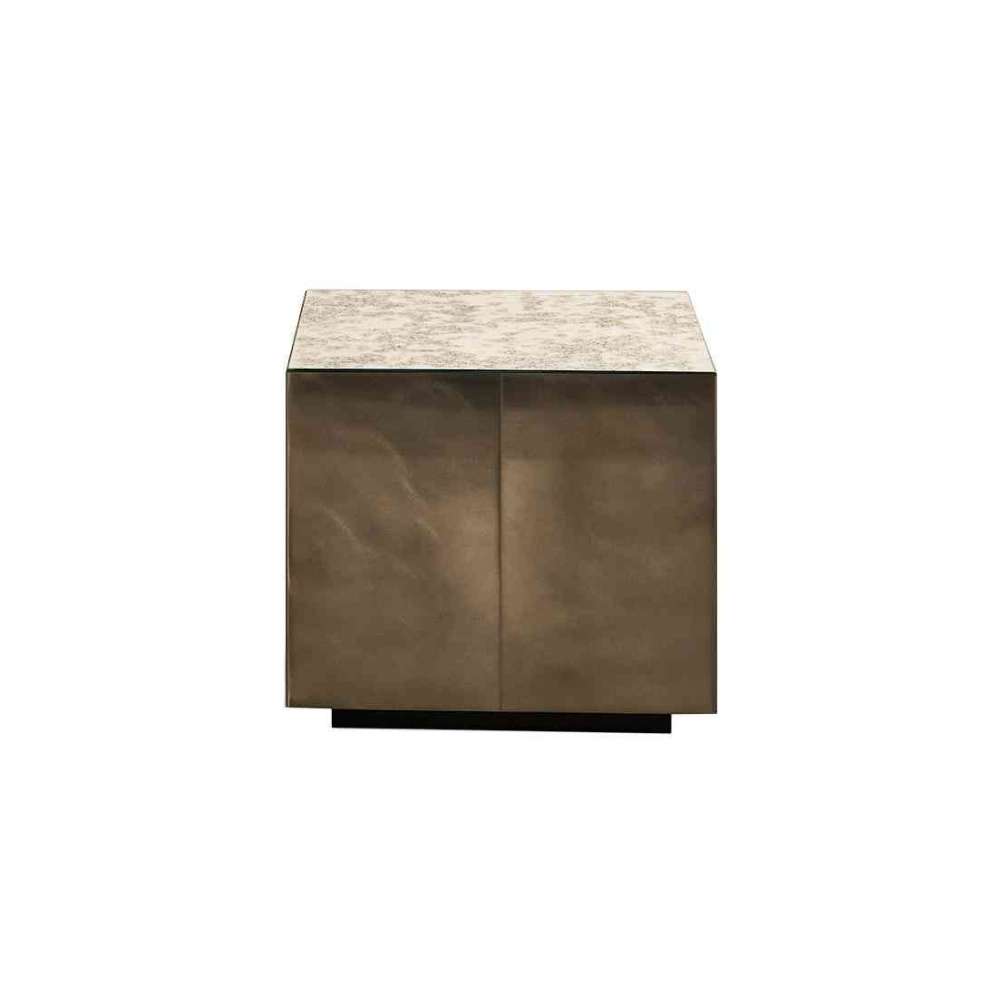 Kluczem formalnym tej rodziny niskich stolików jest geometryczna doskonałość. Obwodowe panele boczne są dostępne z ręcznie wykonanymi wykończeniami, takimi jak brązowany mosiądz lub stal platynowa, z blatami w różnych wykończeniach, od szkła po lustra, lakier i marmur.