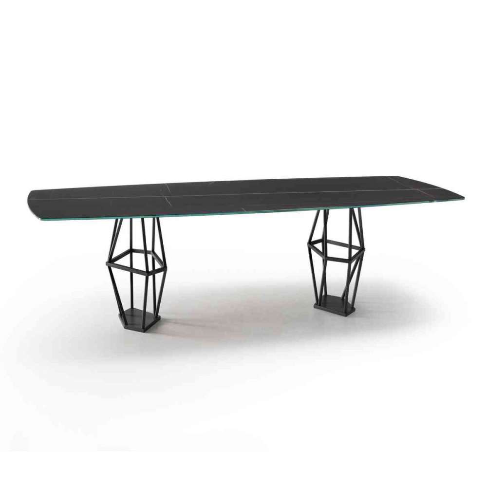 Stół prostokątny. Blat dostępny jest w pięciu różnych wymiarach (cm 160x100x70h / cm 180x100x70h / cm 200x100x70h / cm 220x100x70h / cm 240x100x70h) i trzech rodzajach materiału: superlekkie przezroczyste szkło, Calacatta marmur-szkło, Sahara czarne szkło marmurowe. Metalowe nogi są dostępne w 15 różnych kolorach RAL lub w nowych wykończeniach 2020 ORO/GOLD i RAME/COPPER.