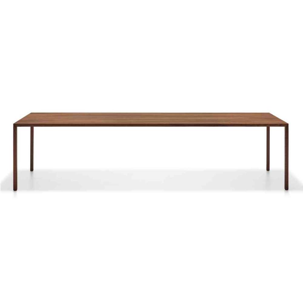 Szlachetne drewno, orzech włoski, wykończone przezroczystym akrylem. Krawędzie i nogi pokryte orzechem ciętym grubości 2 mm, obrabianym z efektem piłowania (szereg nieregularnych nacięć o różnej głębokości). Blat pokryty drewnem o grubości 2 mm, delikatne gładkie wykończenie ze zmiennymi listwami, które nadają powierzchni charakterystyczną gamę odcieni, podkreślając naturalne cechy drewna i surowca. Blat o grubości 35 mm jest nośnym kompozytem płyta zbudowana z wewnętrznej ramy składającej się z profili aluminiowych i wypełniacza styropianowego, z wyjątkiem mosiężnego blatu, który ma wypełnienie z żywicy akrylowej o strukturze plastra miodu, pokryte dwiema zewnętrznymi warstwami aluminium. Stalowe nogi 35x35mm z wewnętrznym ściągiem konstrukcyjnym.
