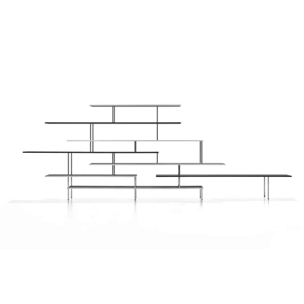 Nieprzerwane pionowe linie przecinają półki, które rozciągają się jak małe trampoliny w pustkę