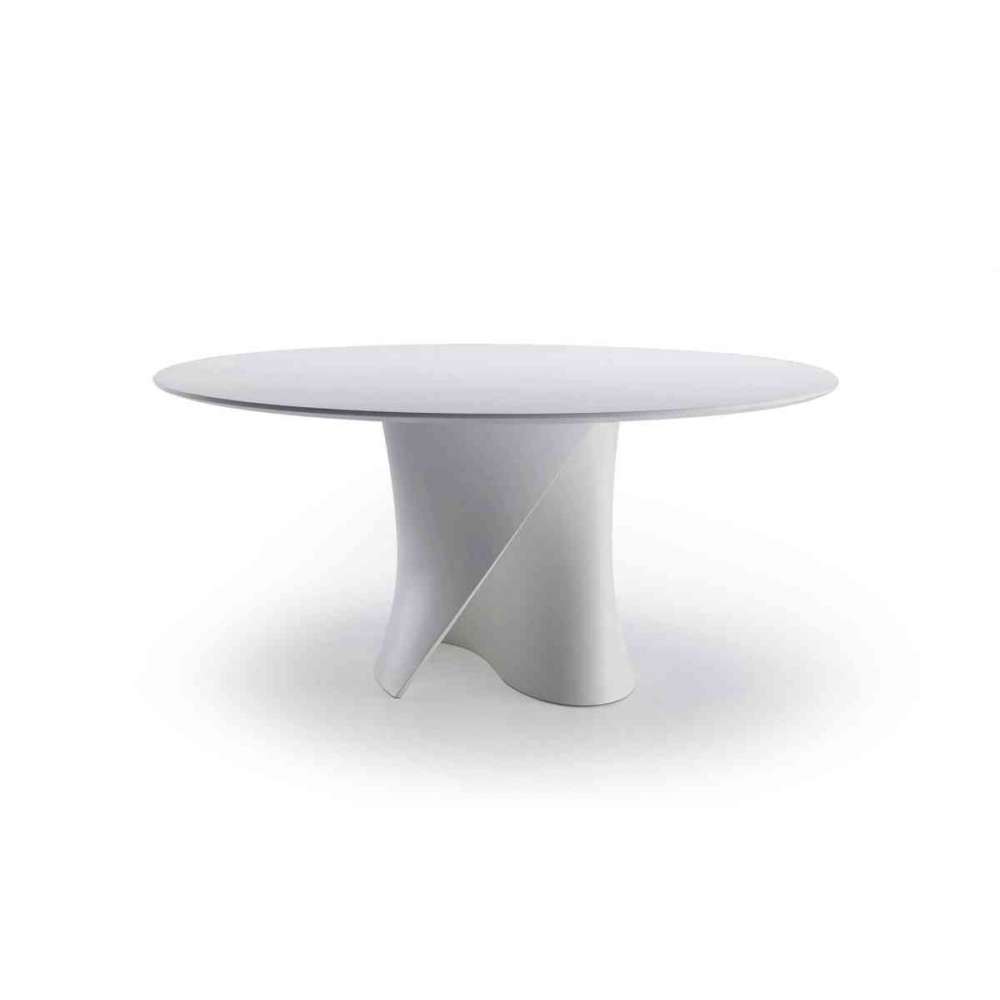 Stoły okrągłe lub owalne. Skręcony stojak w kształcie litery S, formowany w Cristalplant® w matowej bieli lub Ceramilux® w błyszczącej czerni. Blaty do białego stojaka z przezroczystego lub bardzo jasnego szkła o grubości 15 mm lub przezroczystego lub bardzo jasnego szkła hartowanego lub z płyty pilśniowej o średniej gęstości o grubości 30 mm, lakierowanej w kolorze białym matowym z wykończeniem odpornym na zarysowania lub w kolorze Cristalplant® w kolorze matowym biały. Blaty do czarnego stojaka z szarego dymionego szkła hartowanego.