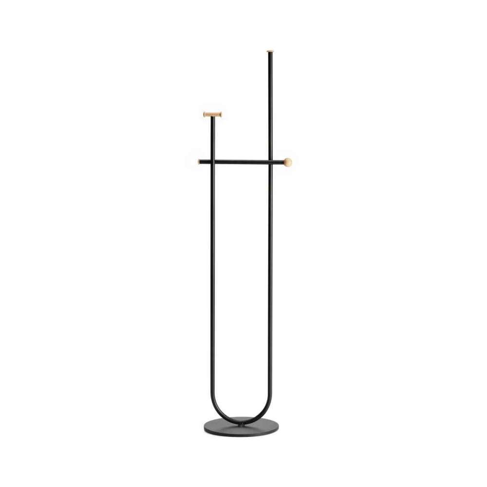 Metalowe i drewniane wstawki współgrają ze sobą, nadając konstrukcji wygląd rzeźby, a także nadając formę praktycznemu elementowi.