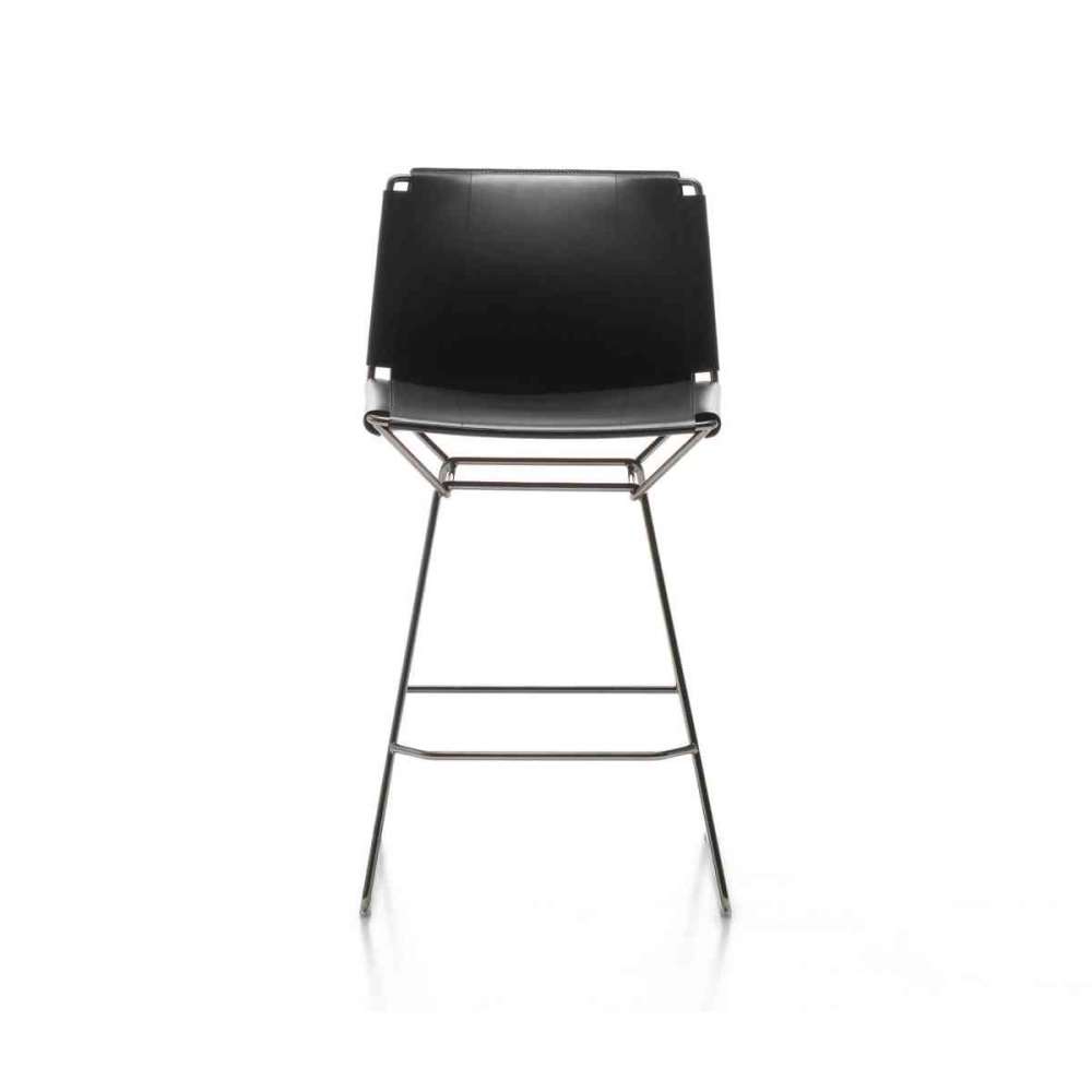 Stalowa rama łożyskowa, dostępna w błyszczącym czarnym chromowanym wykończeniu, przyciąga prosta i lekka architektura, podczas gdy gruba skóra licowa ozdabia ją i tworzy przyjemne siedzisko.
