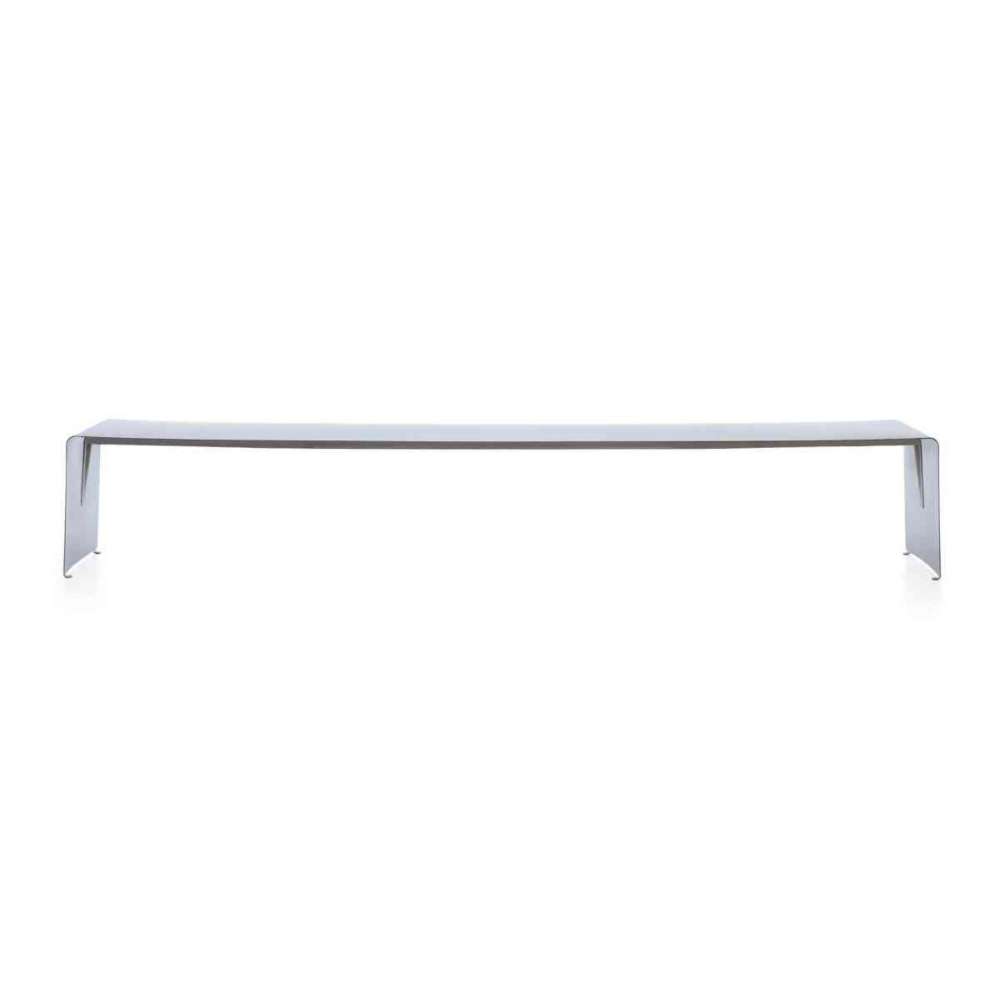 Stół wykonany z giętej blachy aluminiowej. Wykończenie lakierowane aluminium lub biały lakier matowy lub błyszczący. Nadaje się do użytku na zewnątrz.