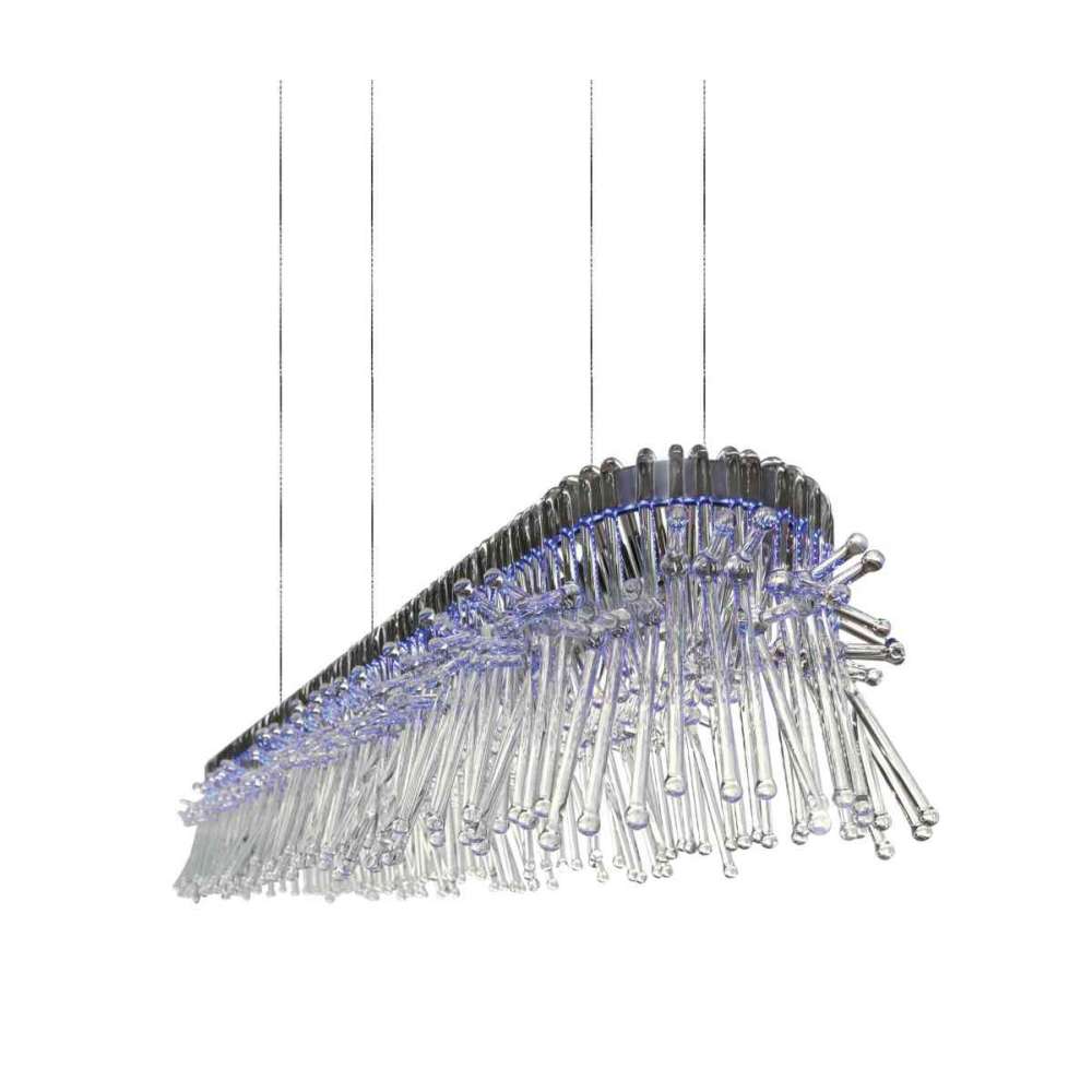 Owalna główna trawers i metalowa taśma obwodowa. Do 184 pojedynczych szklanych haczyków (3 rodzaje) i lamp niskonapięciowych umieszczonych pośrodku, 4x linki zwieszakowe, ściemniacz fazy opadającej, opcjonalnie na 2-kanałowy Insta sterowany radiowo, ma 8o LED: z przełączanym pasmem niebieskiego światła LED. Dostępne różne długości.