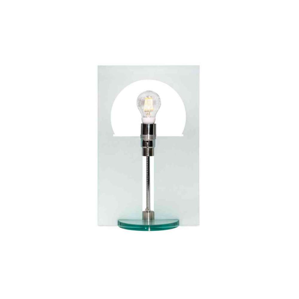 Metalowa oprawka na szklanej podstawie jest sercem lampy. Ale najbardziej rzucającą się w oczy cechą jest satynowana szklana płyta, w której wycięta jest sylwetka lampy Bauhaus. Wyłącznik pociągowy w postaci metalowego łańcuszka z koralikami oraz czarny bawełniany kabel ze ściemniaczem to kolejne ważne cechy, które decydują o designie tej lampy. Tylko do wyczerpania zapasów.