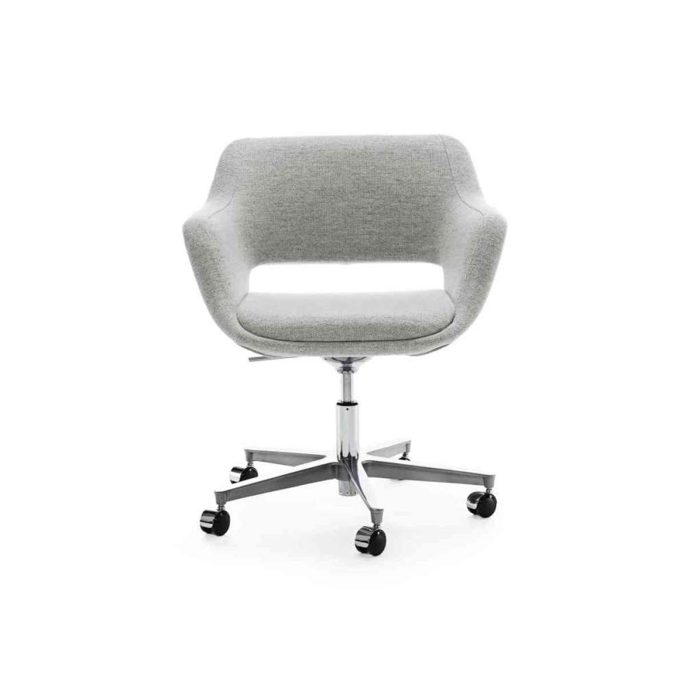 Siedzisko w całości tapicerowane. Pięcioramienna podstawa z kółkami (miękkimi lub twardymi) z polerowanego aluminium.