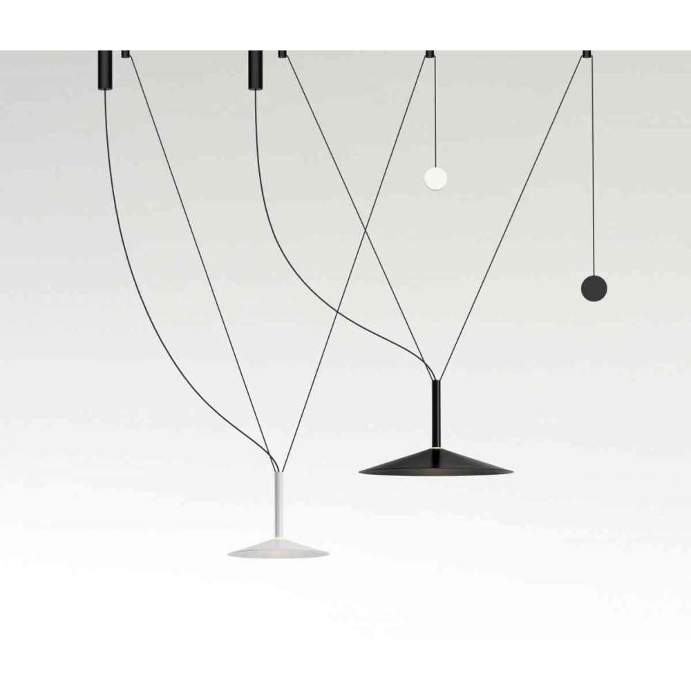 syntetyzując go w jak największym stopniu, pozostaje tylko cylindryczny korpus, zawieszony na wbudowanej diodzie LED. Do tego cylindra możemy dodać różne stożkowe odcienie w dwóch kolorach, oyster white i black, w kilku rozmiarach. Ale najbardziej pomysłowe jest to, że każda z tych lamp może mieć prostą przeciwwagę, tak że gdy są zawieszone między dwoma punktami, można je przesuwać.