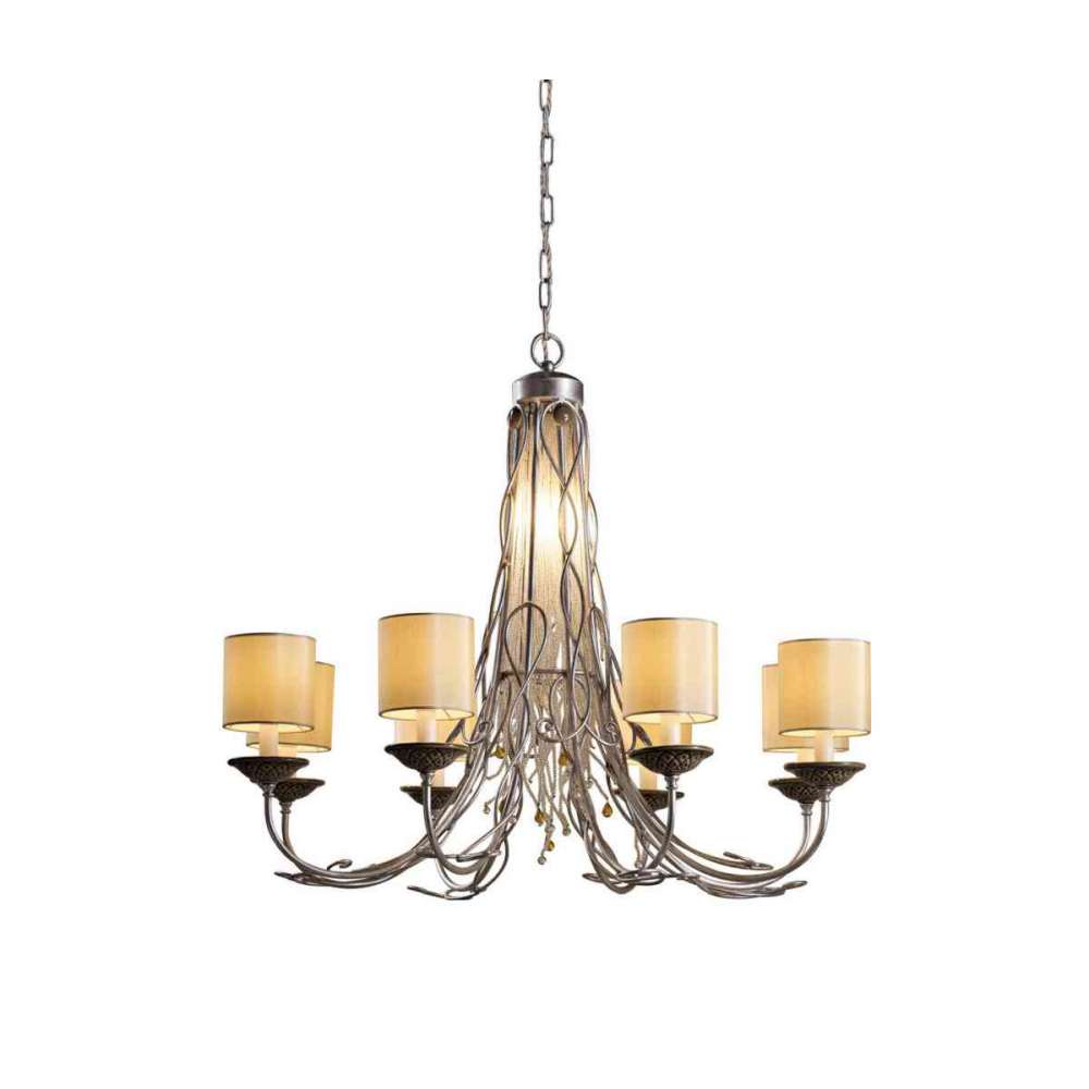 Miękki żyrandol na osiem świateł z cylindrycznymi kloszami. Dostępne w różnych wykończeniach i wymiarach. Można zrobić na miarę. Wymiary: wys.80x96x96 cm