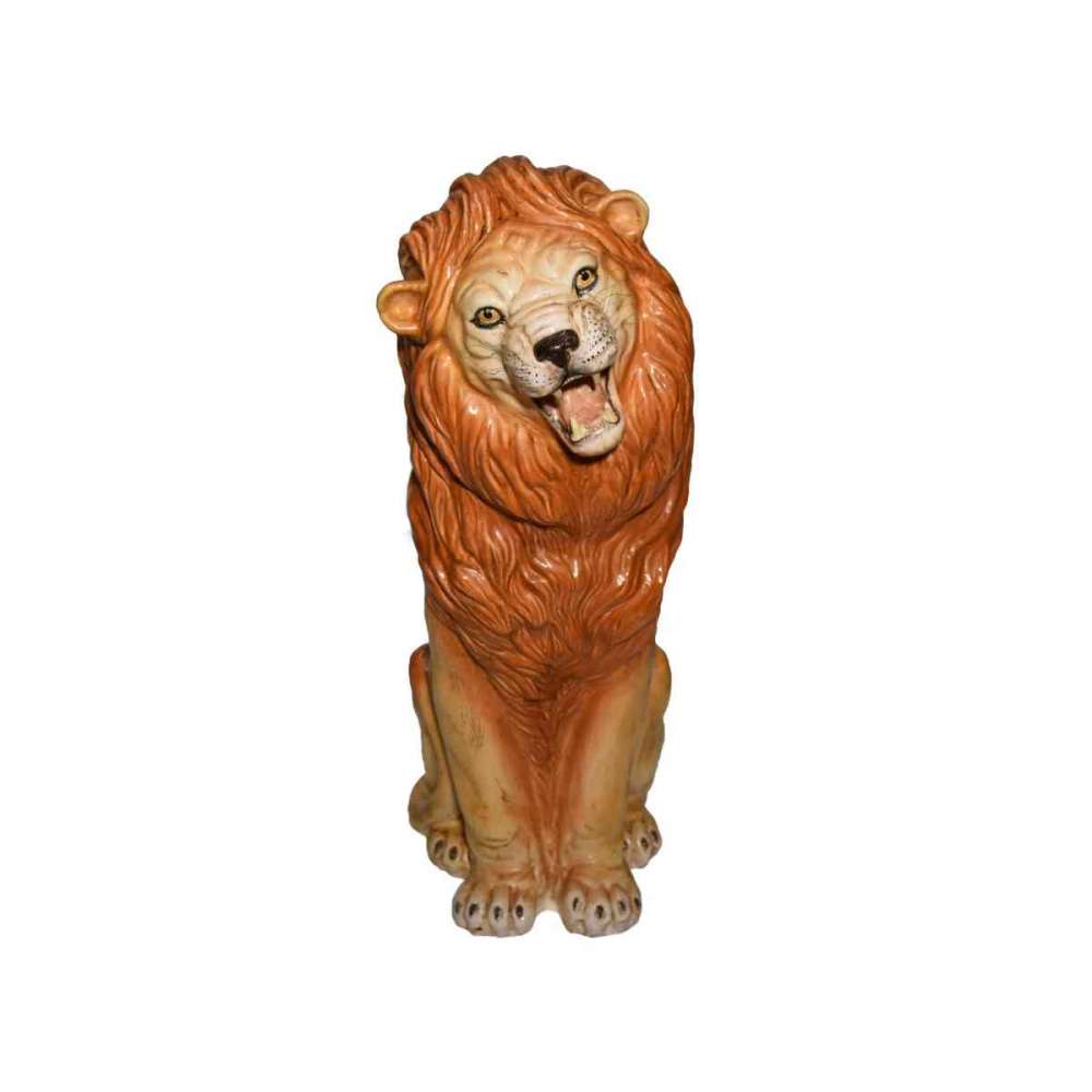 Ceramiczna reprodukcja siedzącego lwa, w całości ręcznie zdobiona naturalnymi kolorami i fakturą kociego futra. Oryginalna rzeźba, idealna do dodania ekskluzywnego i egzotycznego akcentu do Twoich projektów. Wymiary: wys. 90x40x63 cm
