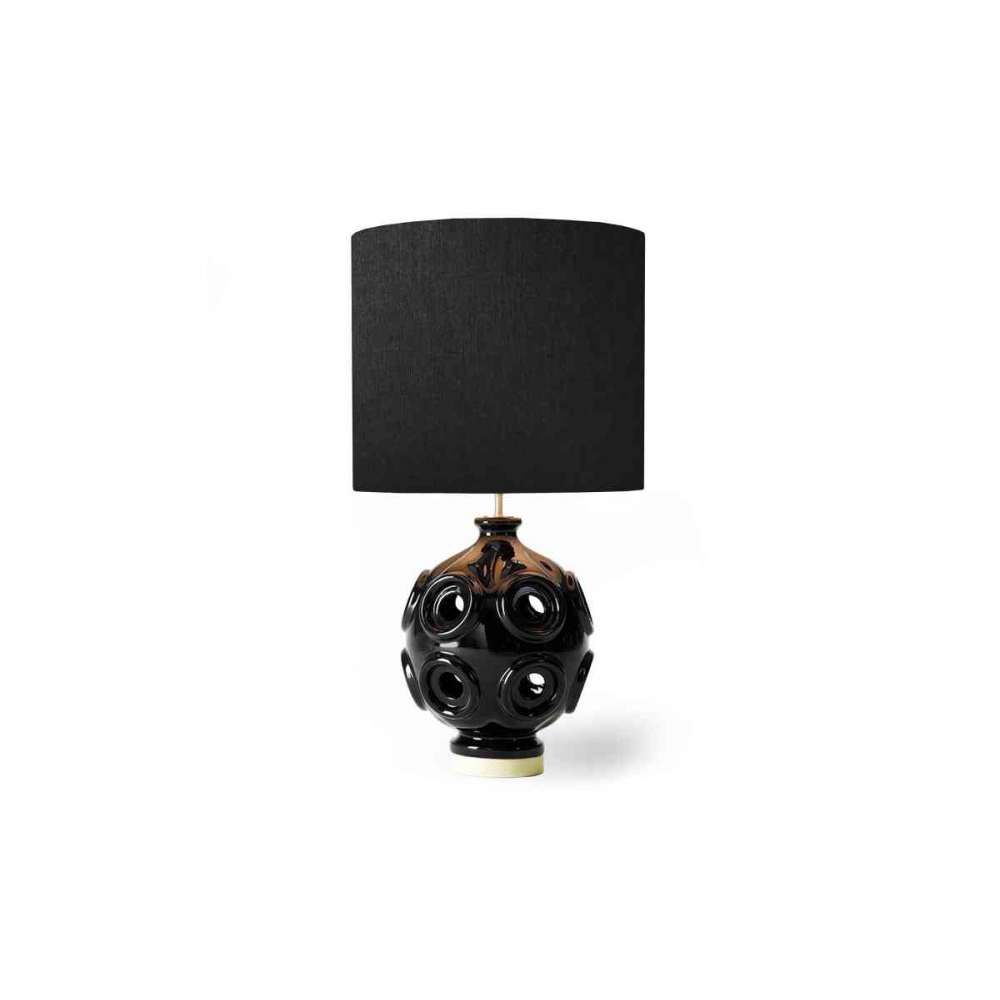 Ceramiczna lampa stołowa Liz z abażurem z tkaniny i drewnianą podstawą. Dostępne w różnych dekoracjach. Wymiary: wys.86x46x46 cm